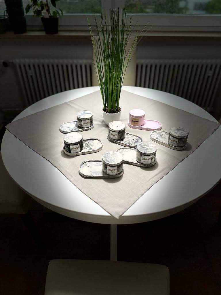 A complete set including a handmade candle and a matching tray for a unified, elegant aesthetic